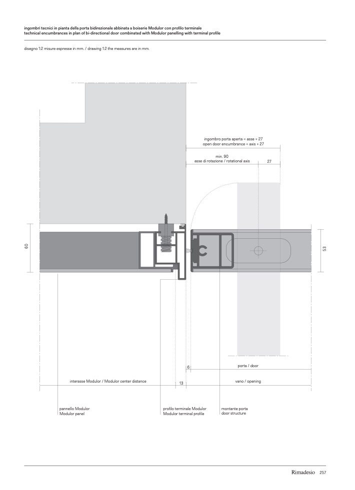 ingombri tecnici in pianta della porta bidirezionale abbinata a boiserie Modulor con profilo terminale