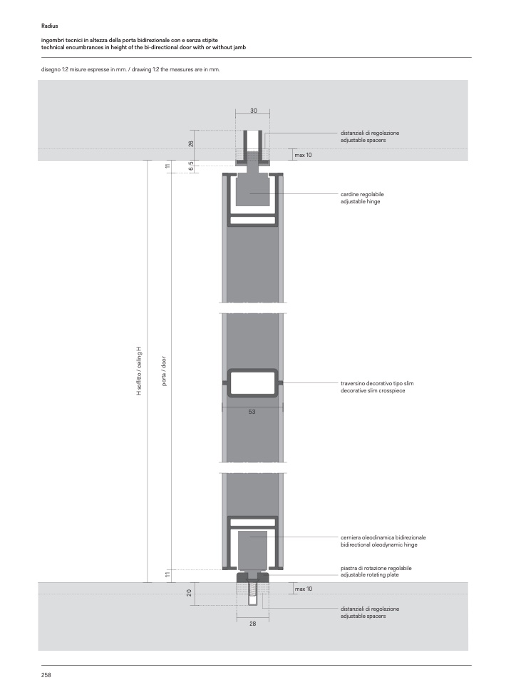 ingombri tecnici in altezza della porta bidirezionale con e senza stipite