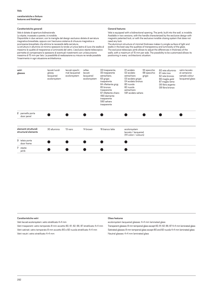 Satinated glasses: 8 mm tempered glass except 80 and 82 nuvola 4+4 mm laminated glass