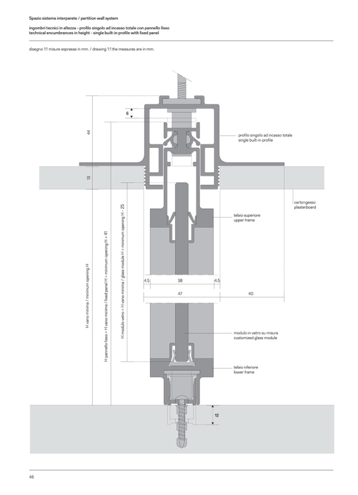 ingombri tecnici in altezza - profilo singolo ad incasso totale con pannello fisso