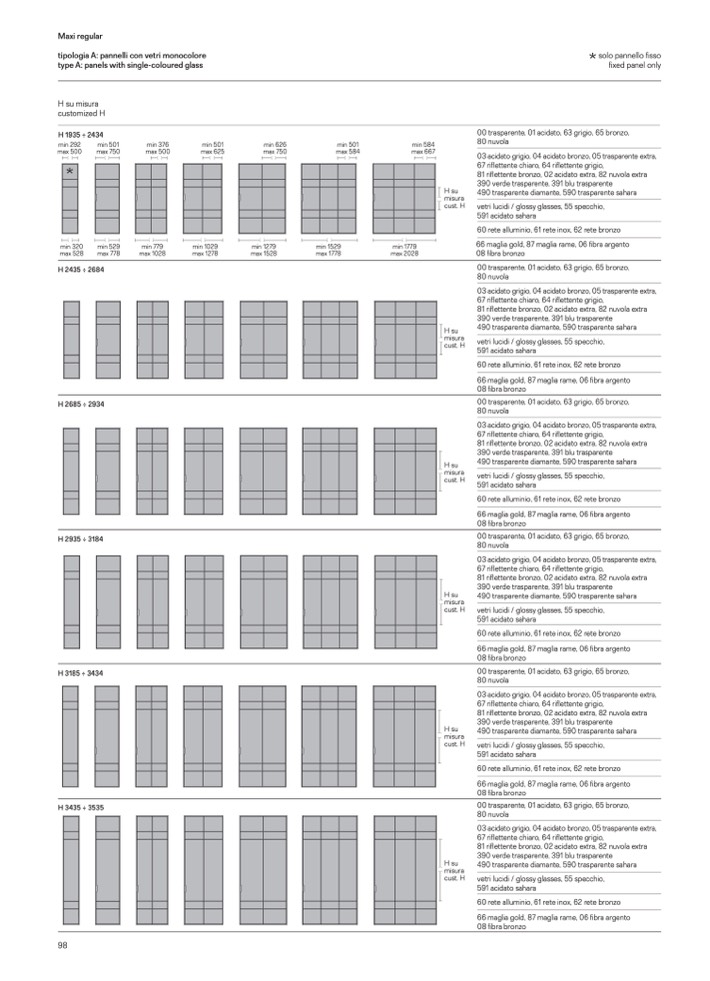 00 trasparente, 01 acidato, 63 grigio, 65 bronzo,