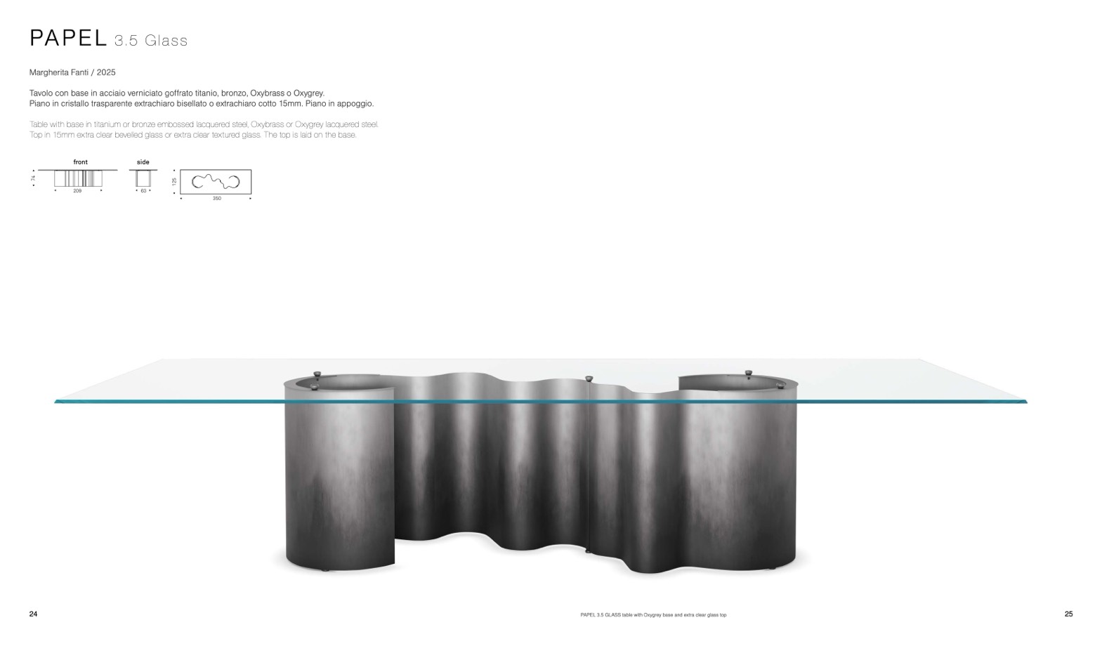 PAPEL 3.5 GLASS table with Oxygrey base and extra clear glass top