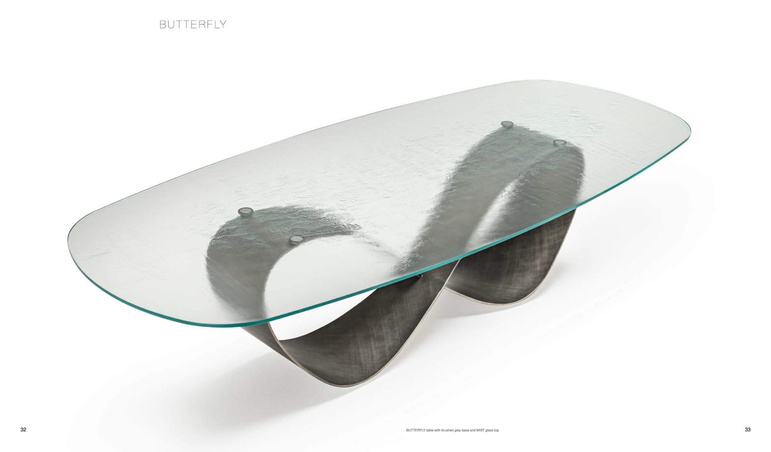 BUTTERFLY table with brushed grey base and MIST glass top