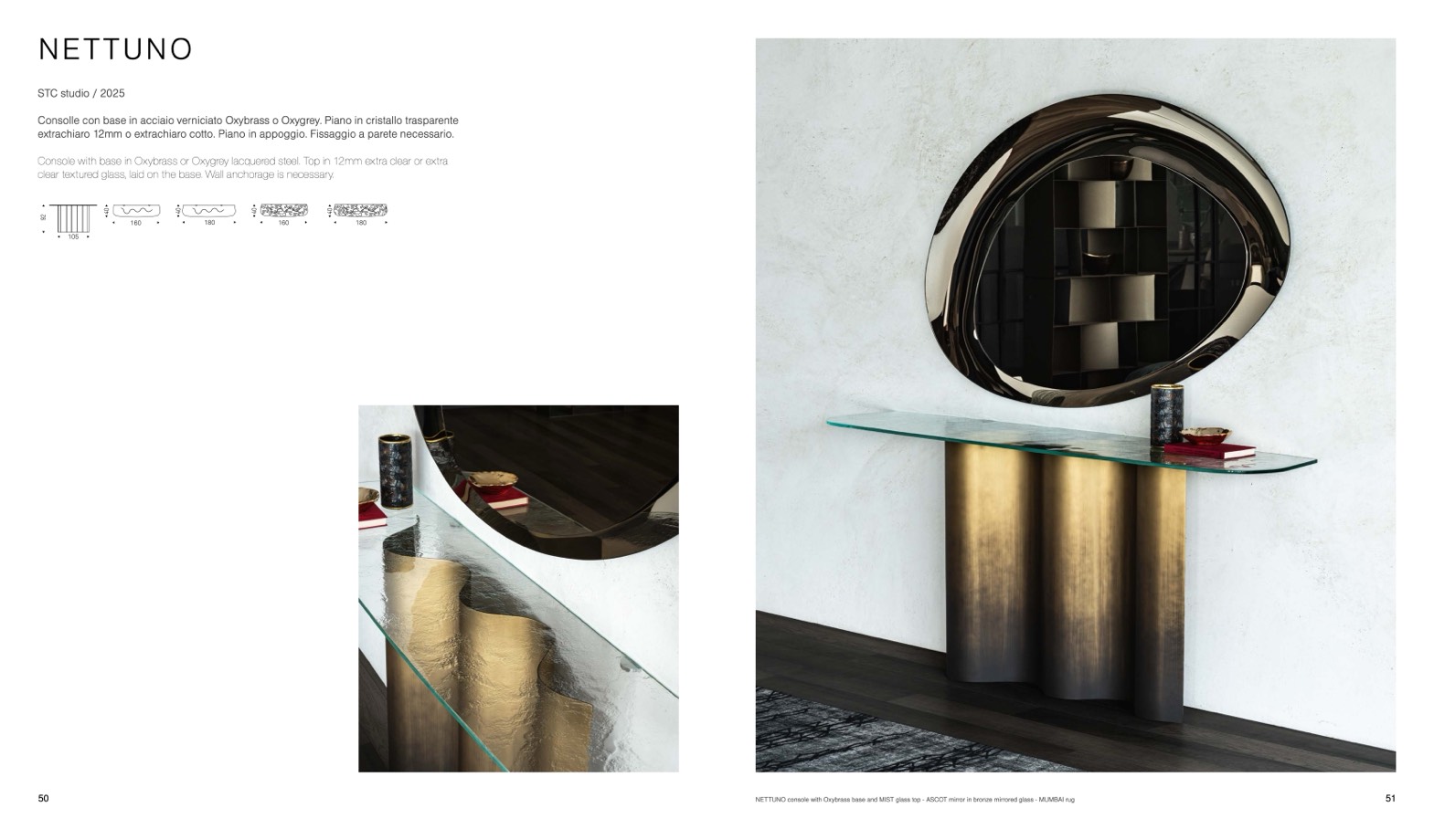 NETTUNO console with Oxybrass base and MIST glass top - ASCOT mirror in bronze mirrored glass - MUMBAI rug