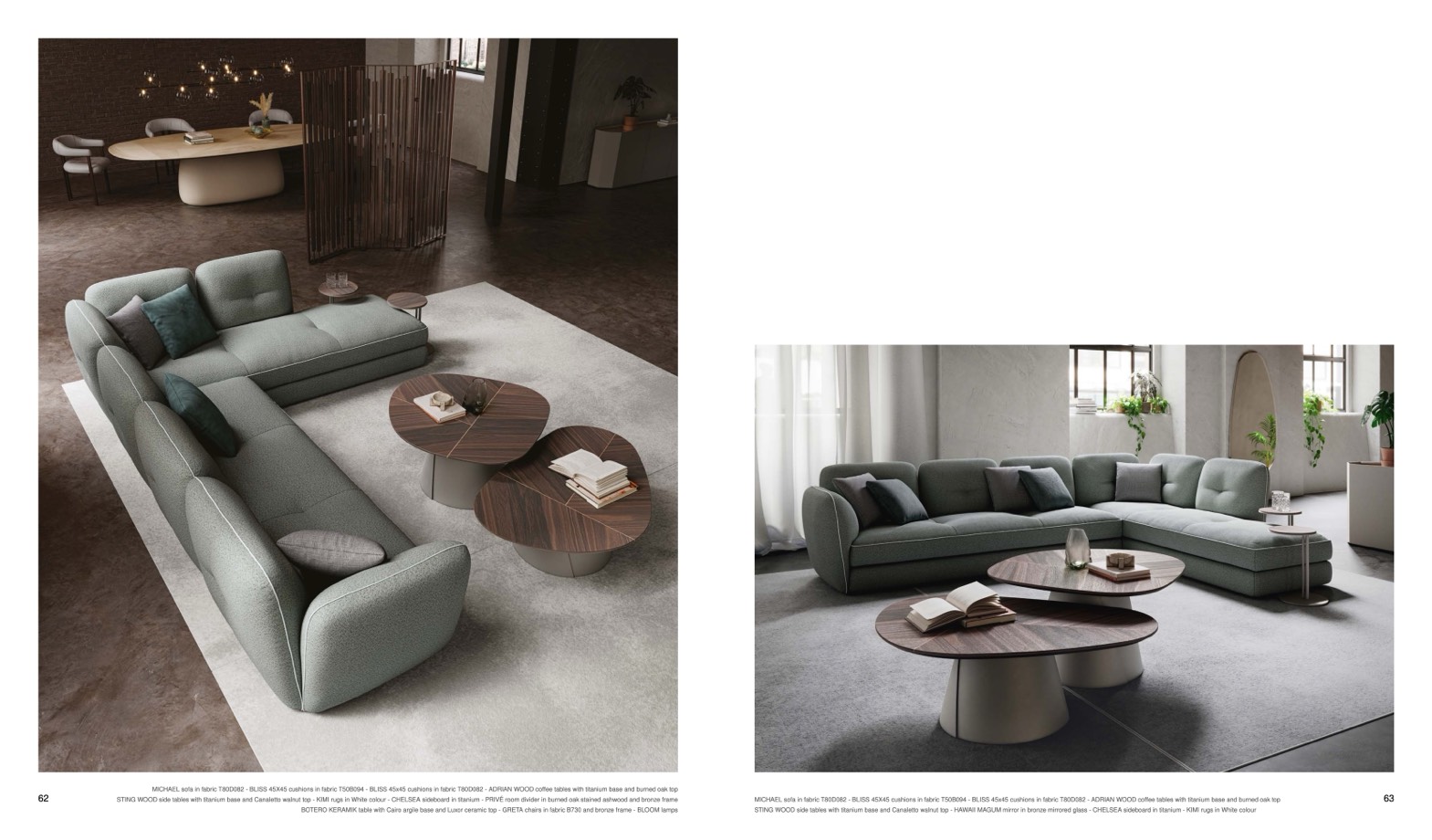 MICHAEL sofa in fabric T80D082 - BLISS 45X45 cushions in fabric T50B094 - BLISS 45x45 cushions in fabric T80D082 - ADRIAN WOOD coffee tables with titanium base and burned oak top