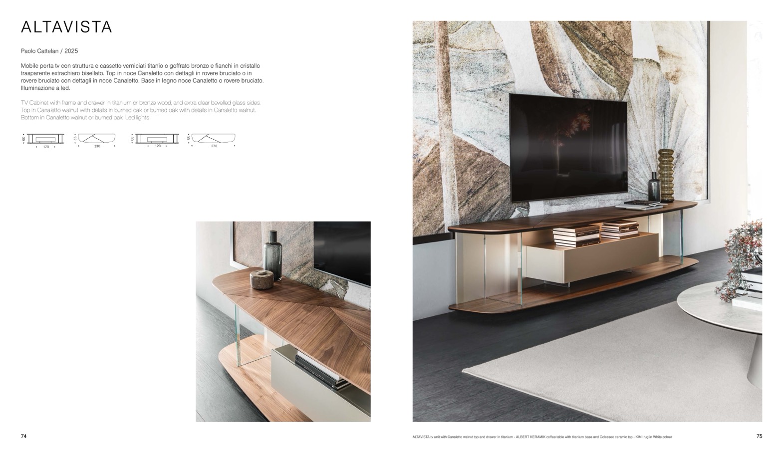 ALTAVISTA tv unit with Canaletto walnut top and drawer in titanium - ALBERT KERAMIK coffee table with titanium base and Colosseo ceramic top - KIMI rug in White colour
