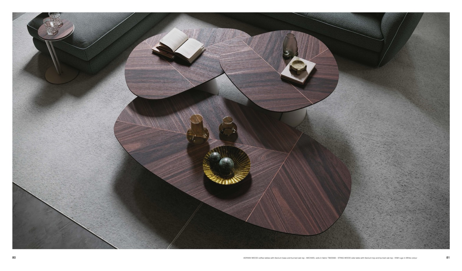 ADRIAN WOOD coffee tables with titanium base and burned oak top - MICHAEL sofa in fabric T80D082 - STING WOOD side table with titanium top and burned oak top - KIMI rugs in White colour