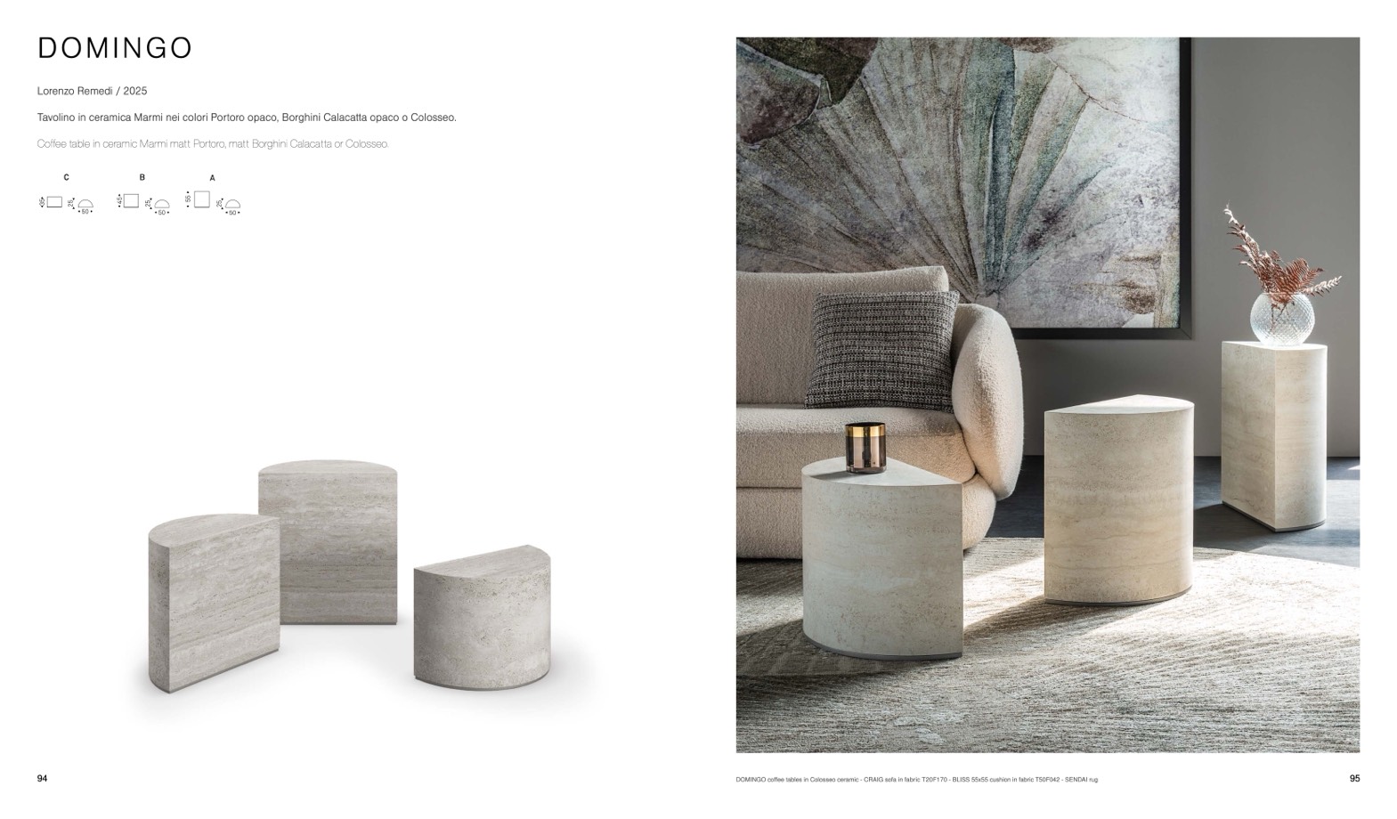 DOMINGO coffee tables in Colosseo ceramic - CRAIG sofa in fabric T20F170 - BLISS 55x55 cushion in fabric T50F042 - SENDAI rug