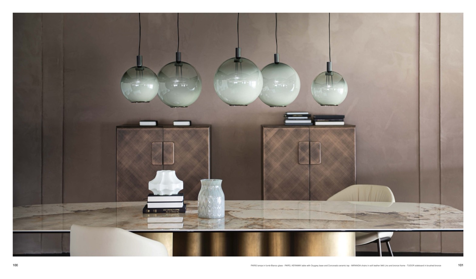 é-Bianco glass - PAPEL KERAMIK table with Oxygrey base and Corcovado ceramic top - MIRANDA chairs in soft leather 948 Lino and bronze frame - TUDOR sideboard in brushed bronze