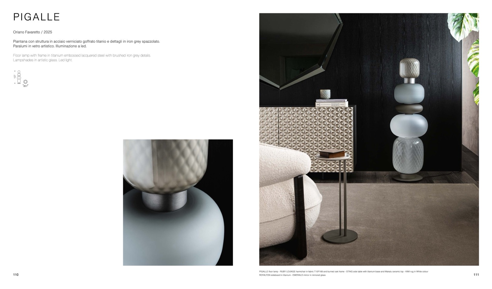 Piantana con struttura in acciaio verniciato goffrato titanio e dettagli in iron grey spazzolato.