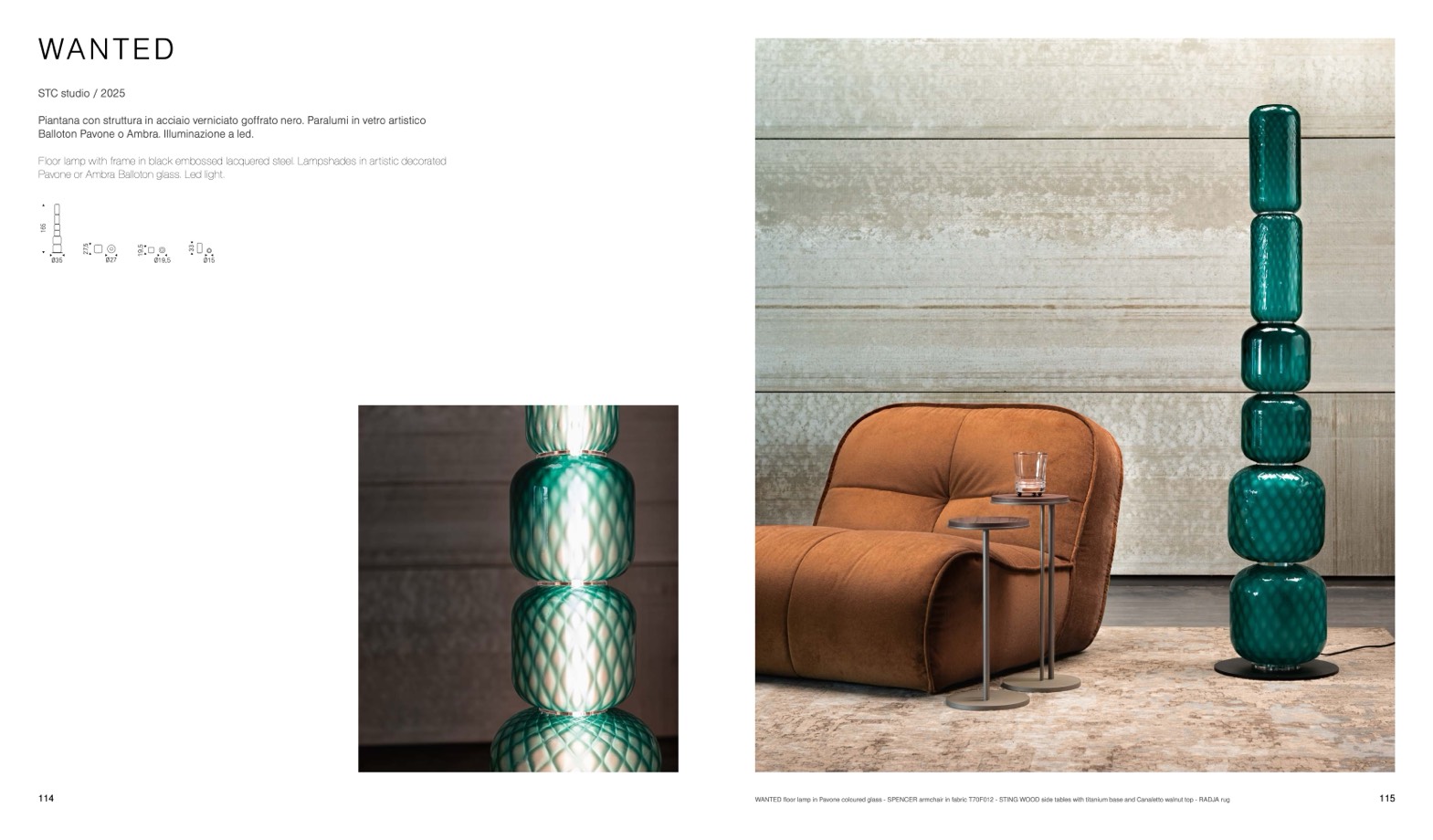 WANTED floor lamp in Pavone coloured glass - SPENCER armchair in fabric T70F012 - STING WOOD side tables with titanium base and Canaletto walnut top - RADJA rug