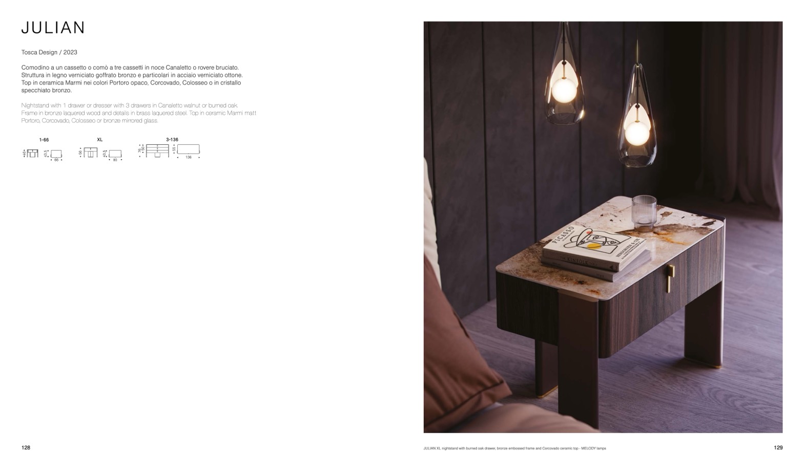JULIAN XL nightstand with burned oak drawer, bronze embossed frame and Corcovado ceramic top - MELODY lamps