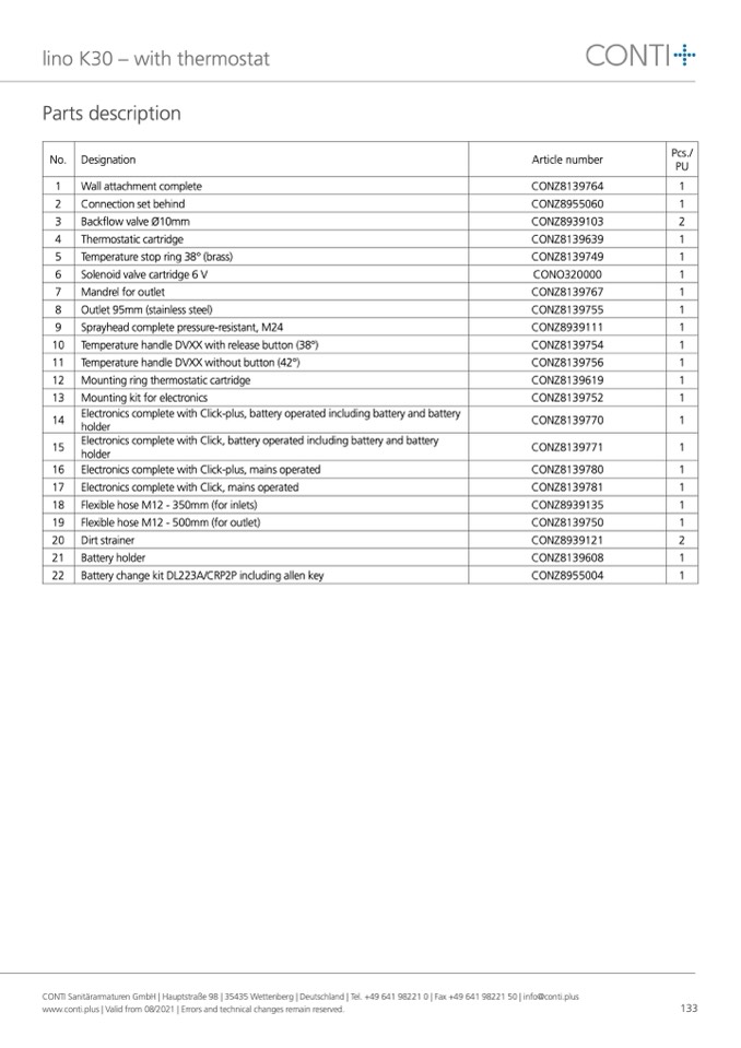 CONTI Sanitärarmaturen GmbH | Hauptstraße 98 | 35435 Wettenberg | Deutschland | Tel. +49 641 98221 0 | Fax +49 641 98221 50 | info@conti.plus