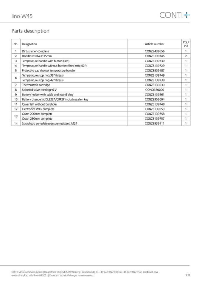 CONTI Sanitärarmaturen GmbH | Hauptstraße 98 | 35435 Wettenberg | Deutschland | Tel. +49 641 98221 0 | Fax +49 641 98221 50 | info@conti.plus