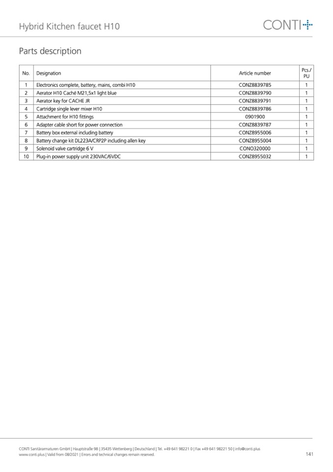 CONTI Sanitärarmaturen GmbH | Hauptstraße 98 | 35435 Wettenberg | Deutschland | Tel. +49 641 98221 0 | Fax +49 641 98221 50 | info@conti.plus