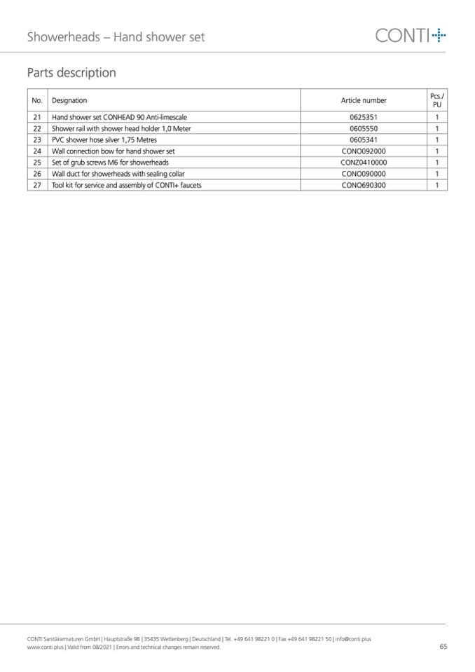 CONTI Sanitärarmaturen GmbH | Hauptstraße 98 | 35435 Wettenberg | Deutschland | Tel. +49 641 98221 0 | Fax +49 641 98221 50 | info@conti.plus
