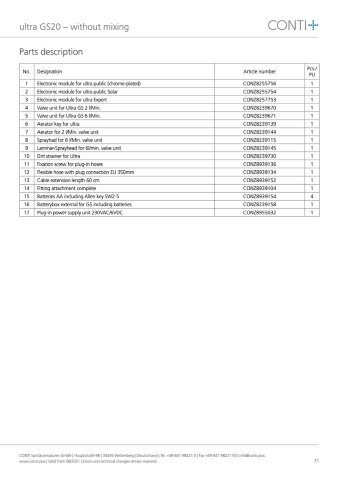 CONTI Sanitärarmaturen GmbH | Hauptstraße 98 | 35435 Wettenberg | Deutschland | Tel. +49 641 98221 0 | Fax +49 641 98221 50 | info@conti.plus