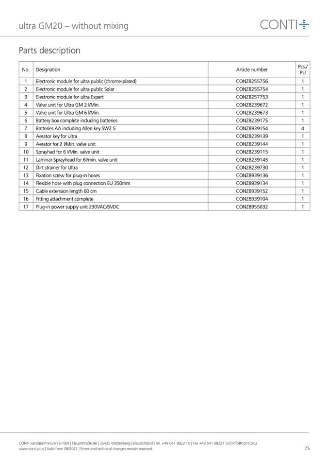 CONTI Sanitärarmaturen GmbH | Hauptstraße 98 | 35435 Wettenberg | Deutschland | Tel. +49 641 98221 0 | Fax +49 641 98221 50 | info@conti.plus
