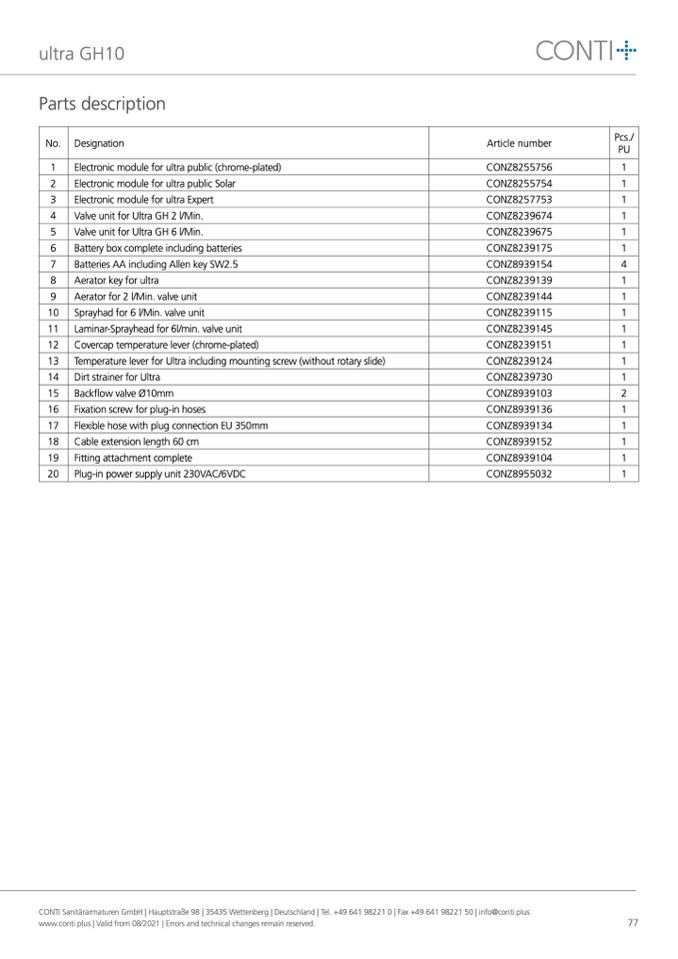 CONTI Sanitärarmaturen GmbH | Hauptstraße 98 | 35435 Wettenberg | Deutschland | Tel. +49 641 98221 0 | Fax +49 641 98221 50 | info@conti.plus