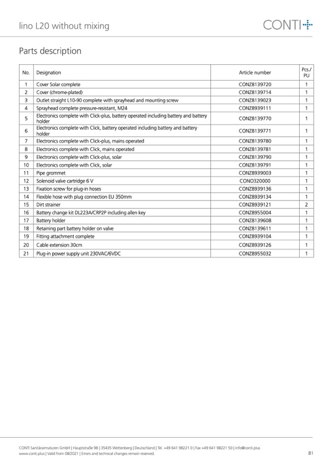 CONTI Sanitärarmaturen GmbH | Hauptstraße 98 | 35435 Wettenberg | Deutschland | Tel. +49 641 98221 0 | Fax +49 641 98221 50 | info@conti.plus