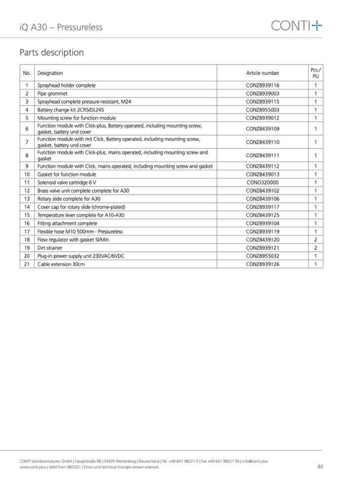 CONTI Sanitärarmaturen GmbH | Hauptstraße 98 | 35435 Wettenberg | Deutschland | Tel. +49 641 98221 0 | Fax +49 641 98221 50 | info@conti.plus