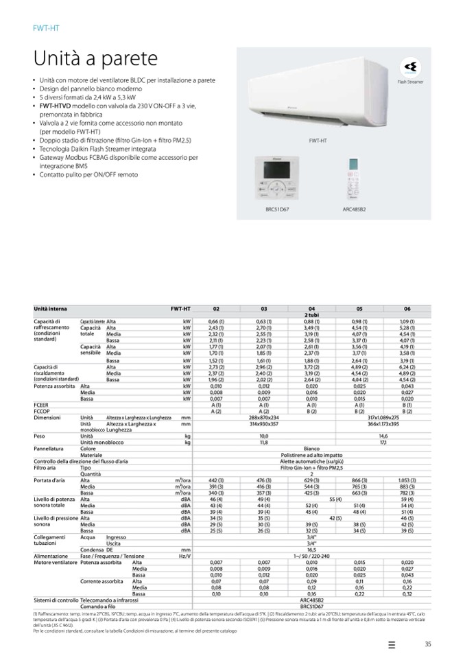 (1) Raffrescamento: temp. interna 27°CBS, 19°CBU; temp. acqua in ingresso 7°C, aumento della temperatura dell'acqua di 5°K. | (2) Riscaldamento: 2 tubi: aria 20°CBU; temperatura dell'acqua in entrata 45°C, cal