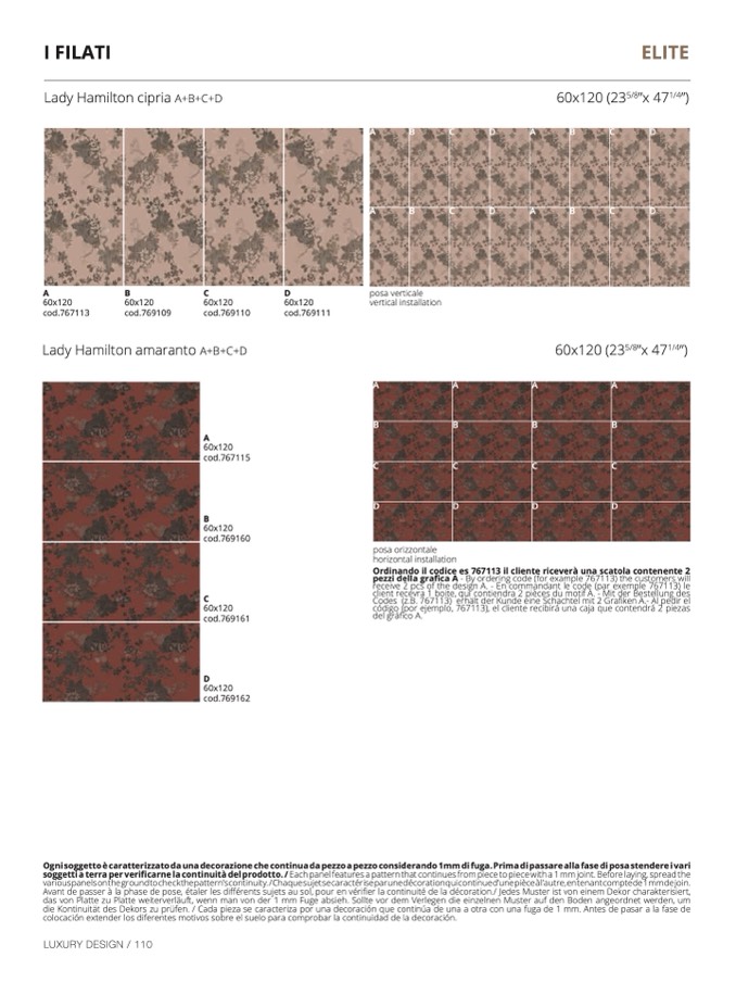 s panels on the ground to check the pattern’s continuity. / Chaque sujet se caractérise par une décoration qui continue d’une pièce à l’autre, en tenant compte de 1 mm de join.