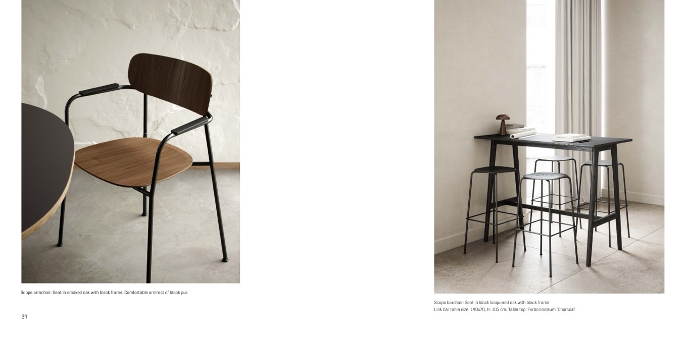 Scope armchair: Seat in smoked oak with black frame. Comfortable armrest of black pur.