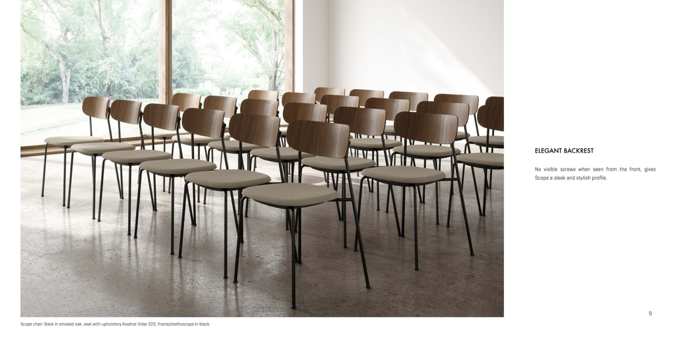 Scope chair: Back in smoked oak, seat with upholstery Kvadrat Vidar 222, frame/stethoscope in black.