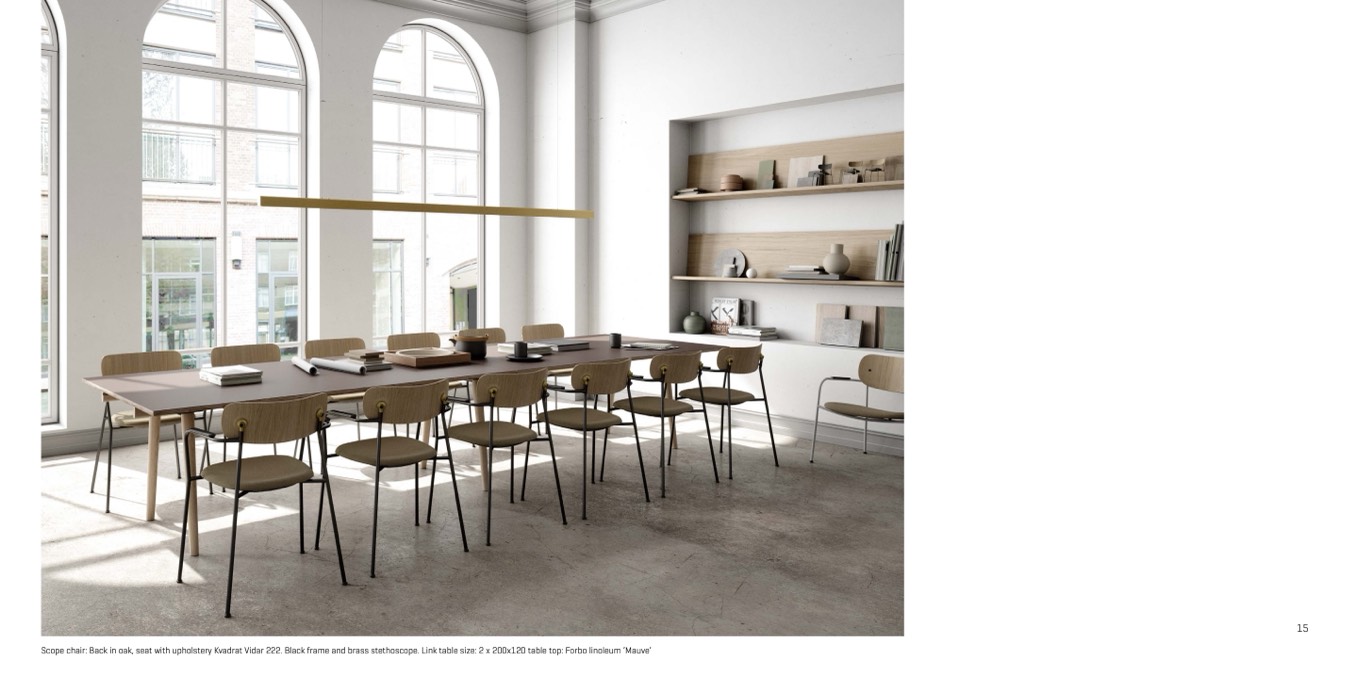 Scope chair: Back in oak, seat with upholstery Kvadrat Vidar 222. Black frame and brass stethoscope. Link table size: 2 x 200x120 table top: Forbo linoleum ’Mauve’