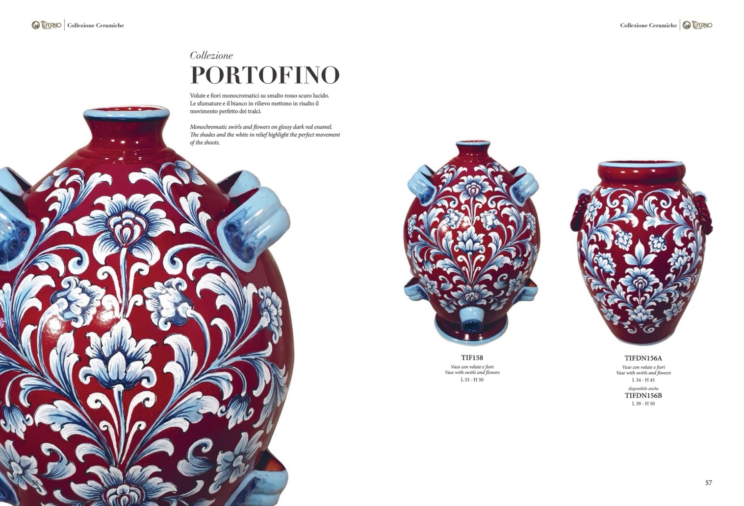 Volute e fiori monocromatici su smalto rosso scuro lucido.