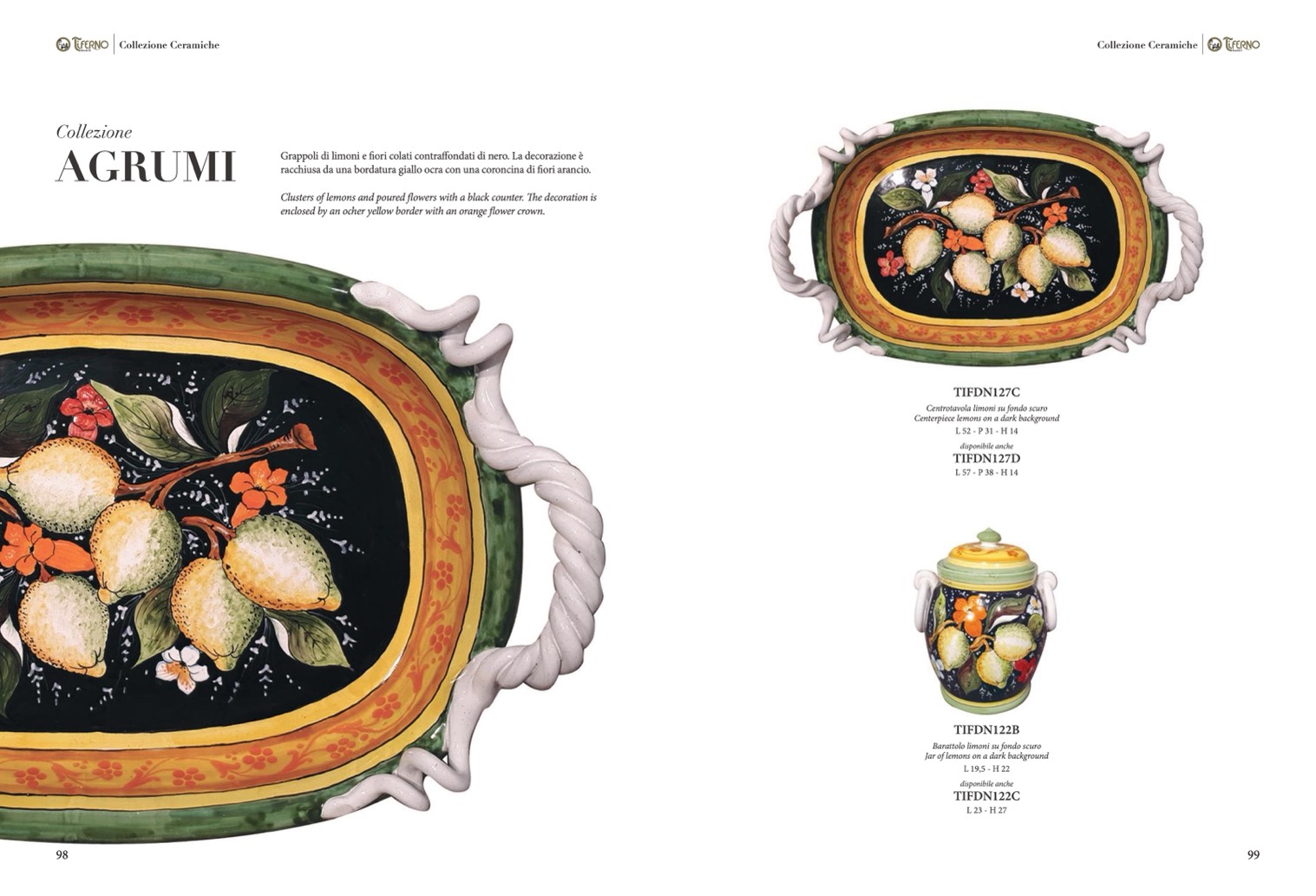Grappoli di limoni e fiori colati contraffondati di nero. La decorazione è