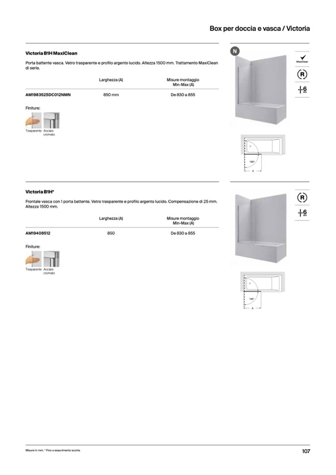 Frontale vasca con 1 porta battente. Vetro trasparente e profilo argento lucido. Compensazione di 25 mm.