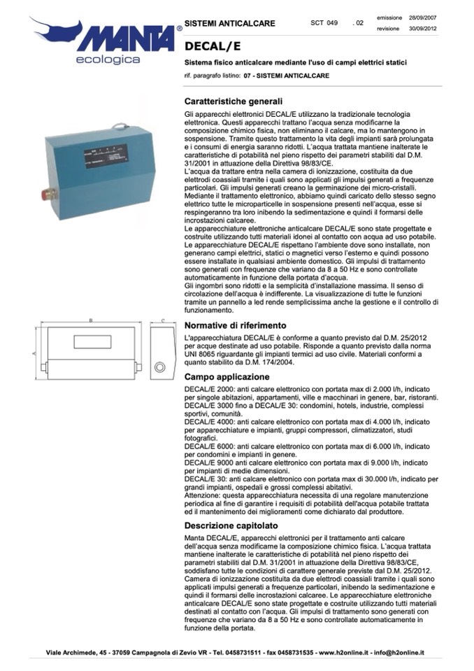 Manta DECAL/E, apparecchi elettronici per il trattamento anti calcare