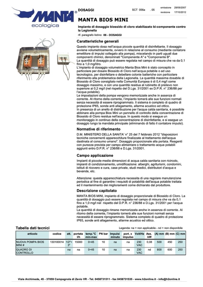 MANTA BIOS MINI, impianto di dosaggio proporzionale di Biossido di Cloro. La