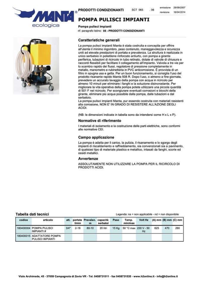 La pompa pulisci impianti Manta è stata costruita e concepita per offrire