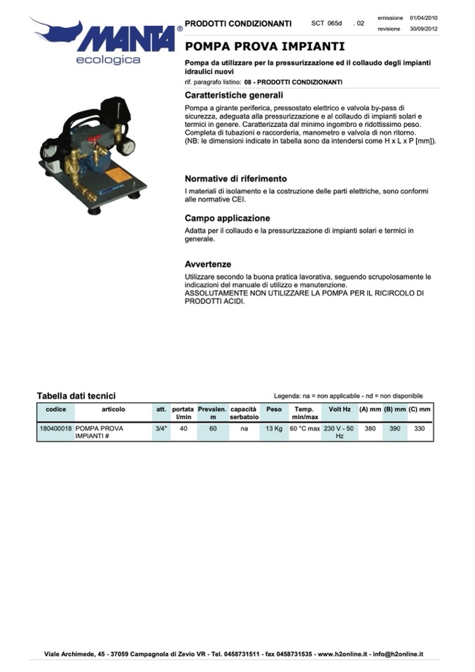 Adatta per il collaudo e la pressurizzazione di impianti solari e termici in