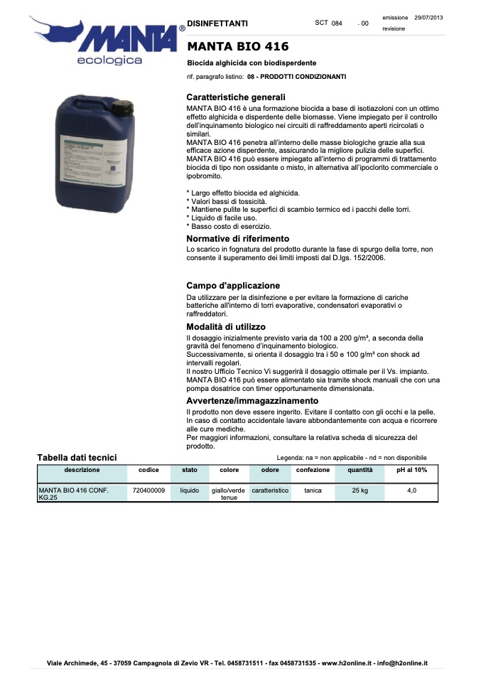 MANTA BIO 416 è una formazione biocida a base di isotiazoloni con un ottimo