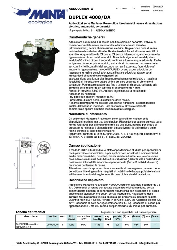 Addolcitore Mantatec R-evolution 4000/DA con tino salamoia separato da 75