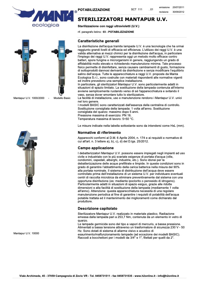 salino dell’acqua. Tutte le apparecchiature a raggi U.V. proposte da Manta