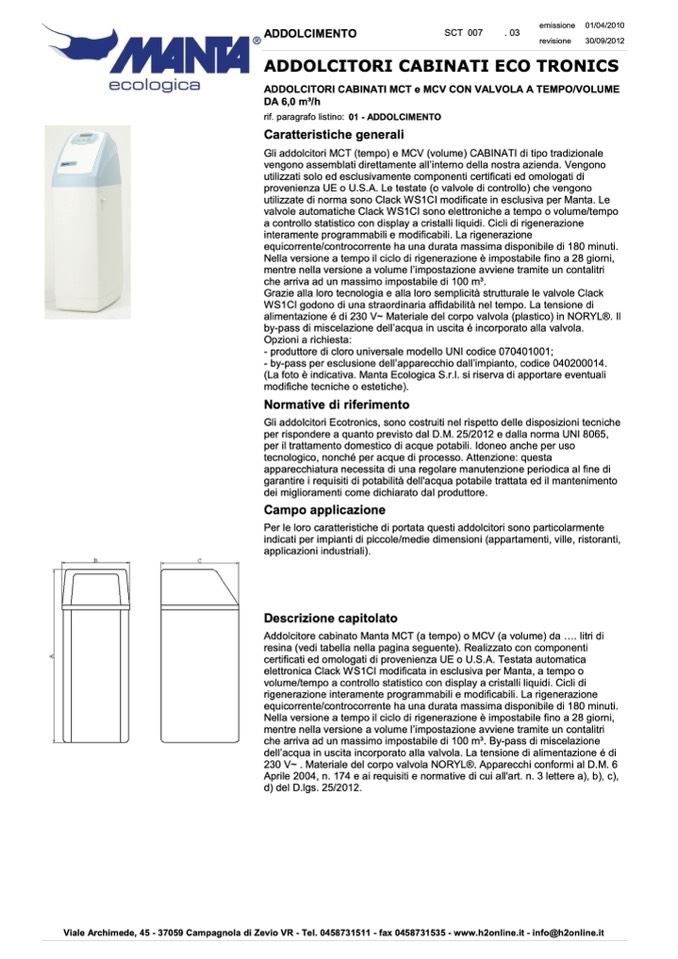 Addolcitore cabinato Manta MCT (a tempo) o MCV (a volume) da .... litri di