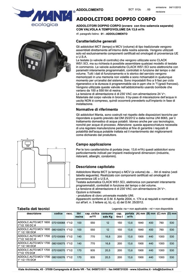 Addolcitore Manta MCT (a tempo) o MCV (a volume) da ... litri di resina (vedi