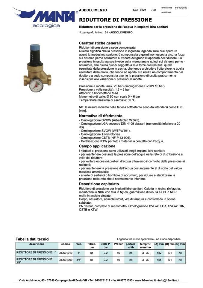 PN 16 bar, completo di manometro. Omologazione DVGW, LGA, SVGW, TIN,