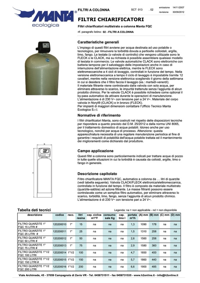 Filtro chiarificatore MANTA FQC, automatico a colonna da ... litri di quarzite