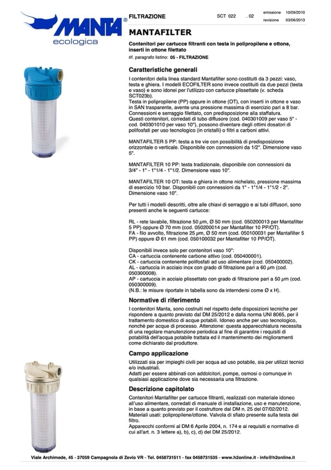 MANTAFILTER 10 PP: testa tradizionale, disponibile con connessioni da