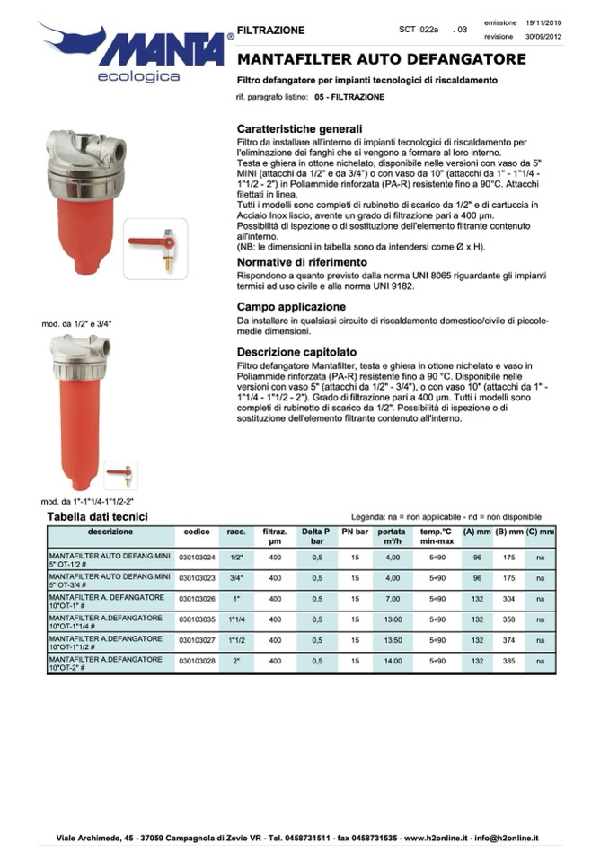 1"1/4 - 1"1/2 - 2"). Grado di filtrazione pari a 400 μm. Tutti i modelli sono