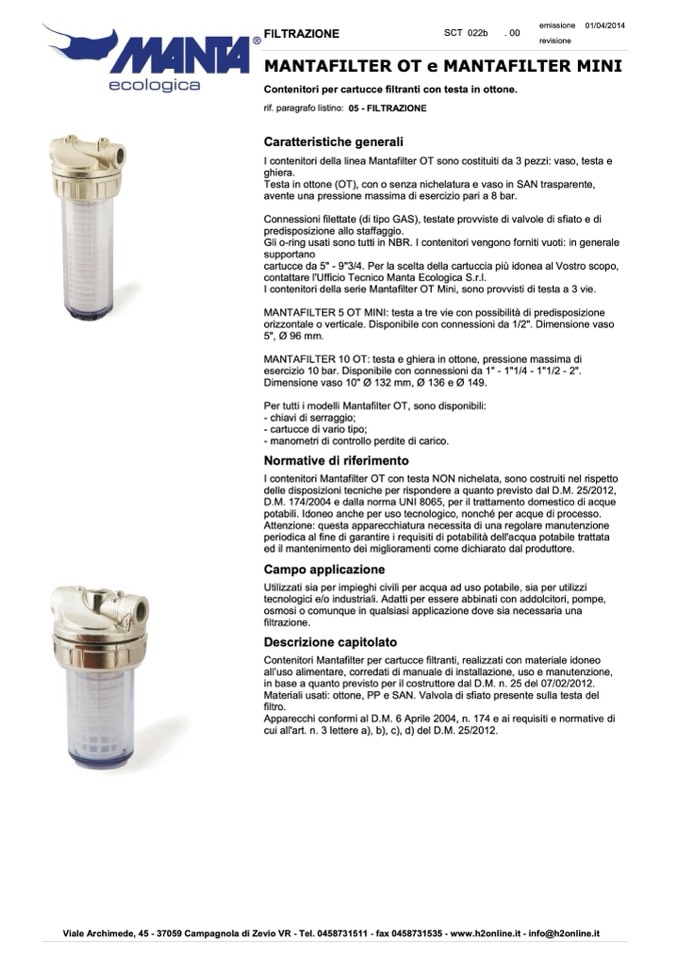 I contenitori Mantafilter OT con testa NON nichelata, sono costruiti nel rispetto