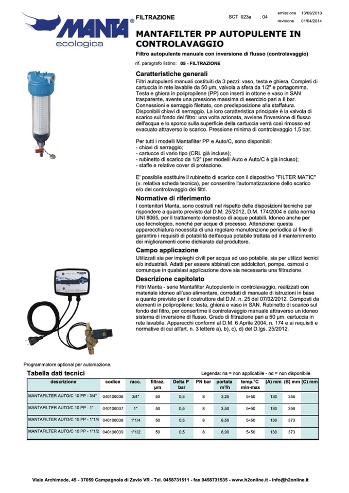 Per tutti i modelli Mantafilter PP e Auto/C, sono disponibili: