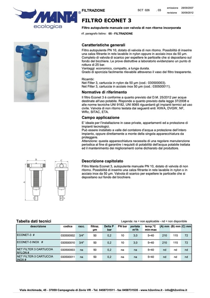 Il filtro Econet 3 è conforme a quanto previsto dal D.M. 25/2012 per acque