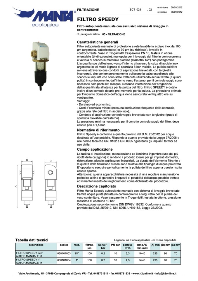 Il filtro Speedy è conforme a quanto previsto dal D.M. 25/2012 per acque